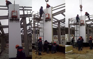 Монтаж панелей вакуумных захватом ARLIFTER SP-4 при строительстве склада в городе Новосибирск
