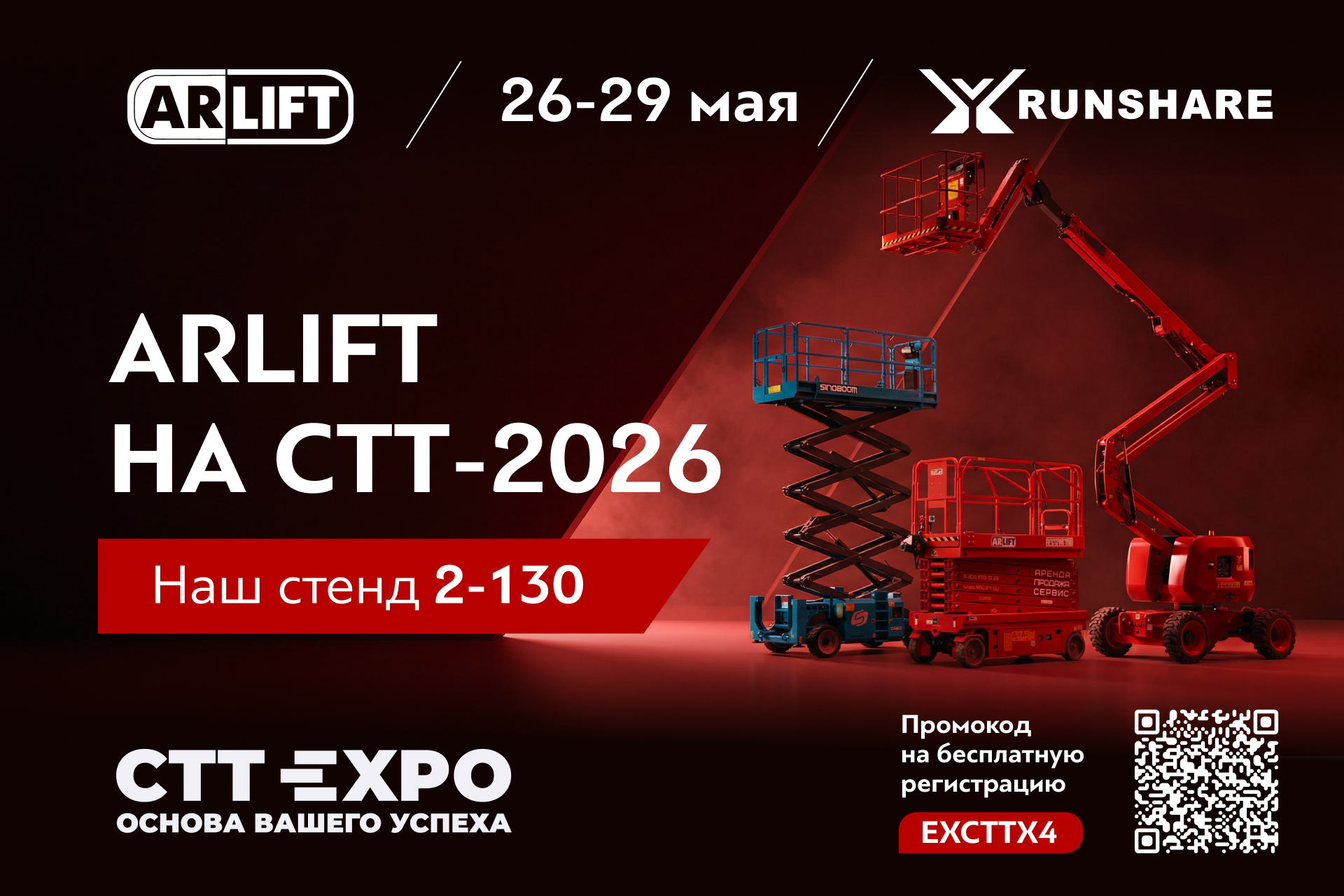 На нашем стенде 2-130 вы увидите парк ARLIFT вживую: подъёмники (AWP) от нашего партнёра-производителя RUNSHARE, мини-краны и вакуумные захваты собственного производства для стекла и сэндвич-панелей. Последние — наша собственная разработка, адаптированная под российские условия. Именно они помогали остеклить Лахта-Центр и Москва-Сити.